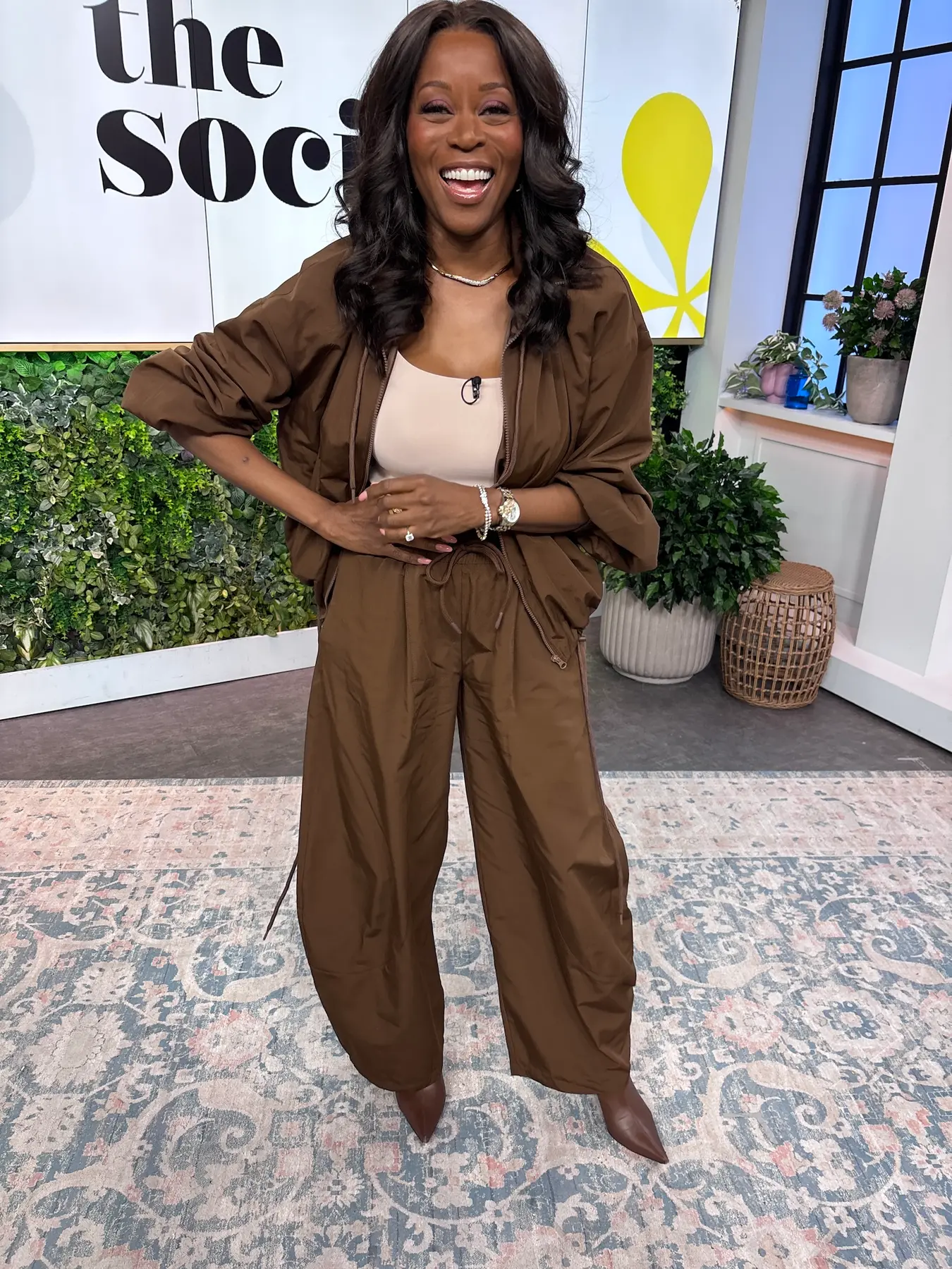 These trousers are crafted from woven fabric in a chocolate shade. They feature a mid-rise, elasticated waist with functional pockets on a barrel leg.